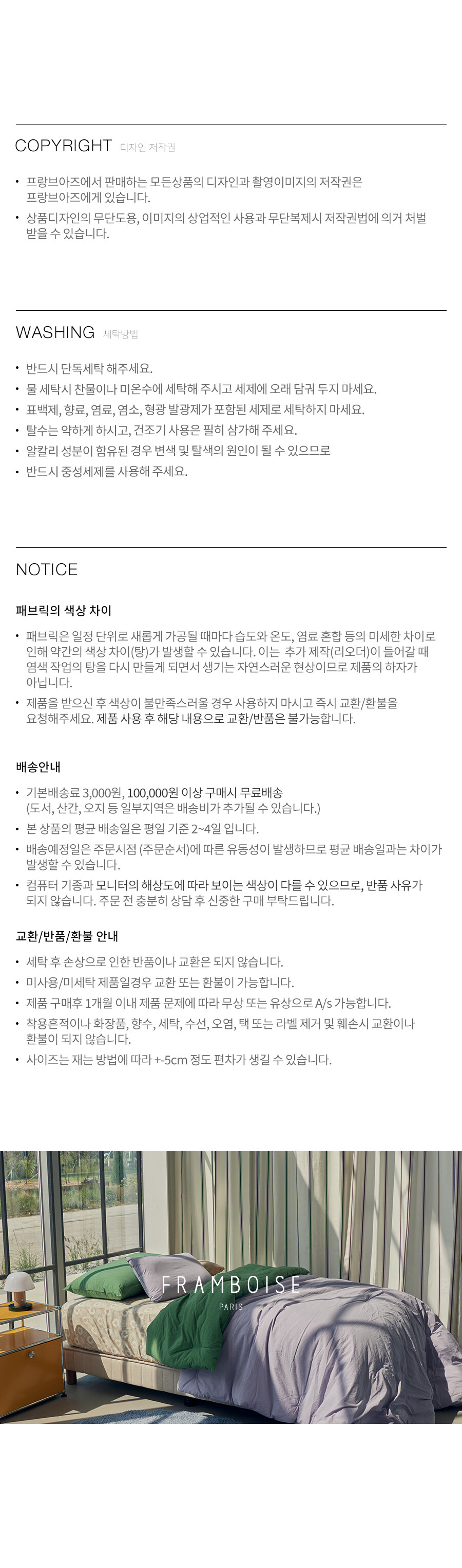 · 사이즈 및 색상 교환은 세탁 전에만 가능하며 제품 불량이 아닐 경우에는 택배비는 고객 부담입니다.