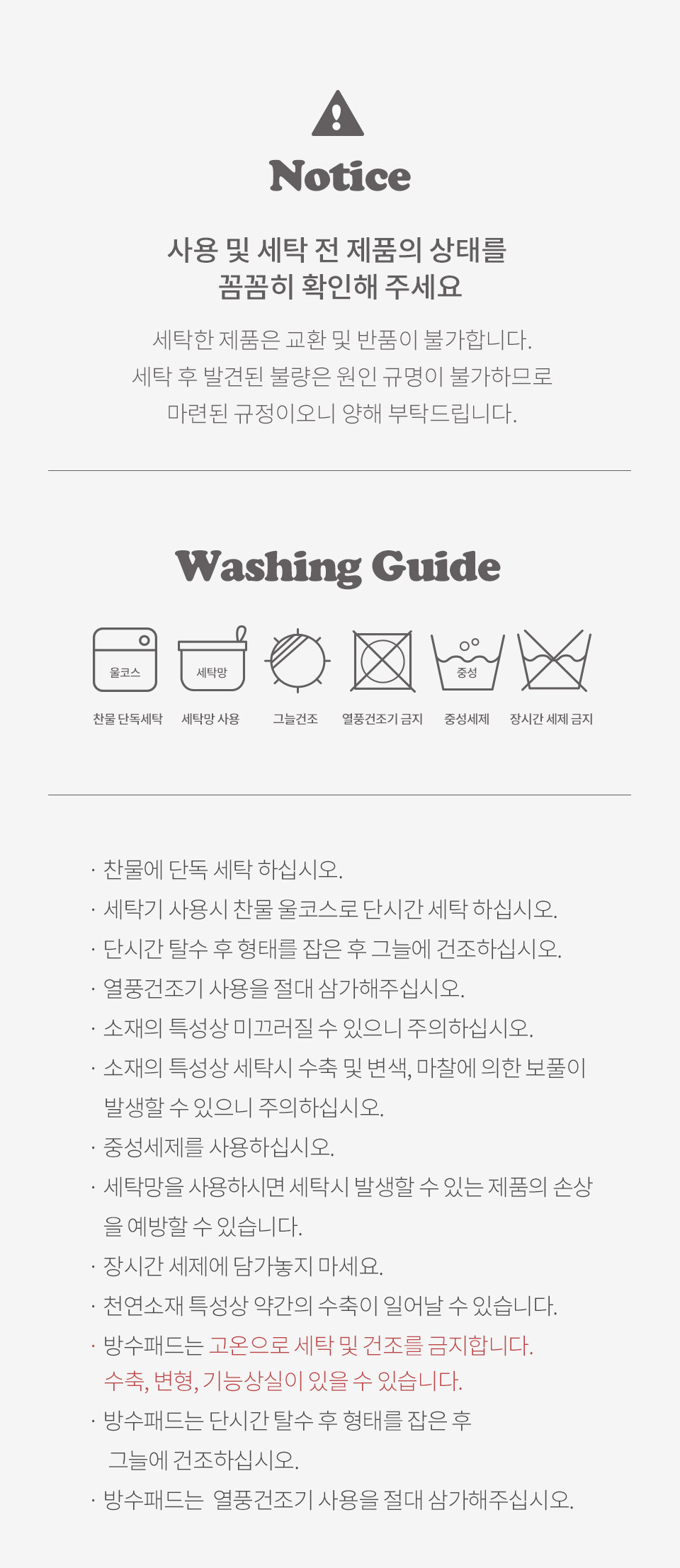 · 건조기 사용 시 제품에 손상이나 수축 및 변형이 올 수 있으므로 자연 건조를 권장 드립니다.