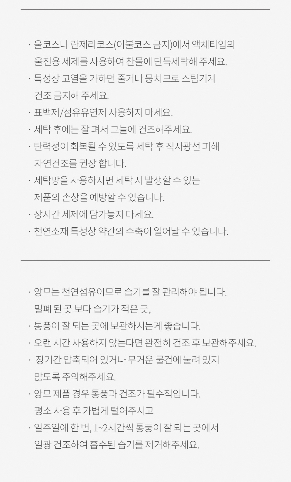 · 건조기 사용 시 제품에 손상이나 수축 및 변형이 올 수 있으므로 자연 건조를 권장 드립니다.