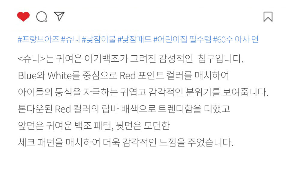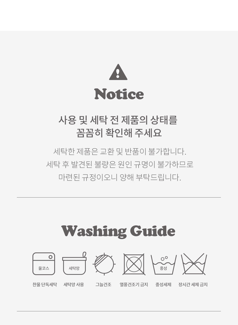 · 건조기 사용 시 제품에 손상이나 수축 및 변형이 올 수 있으므로 자연 건조를 권장 드립니다.