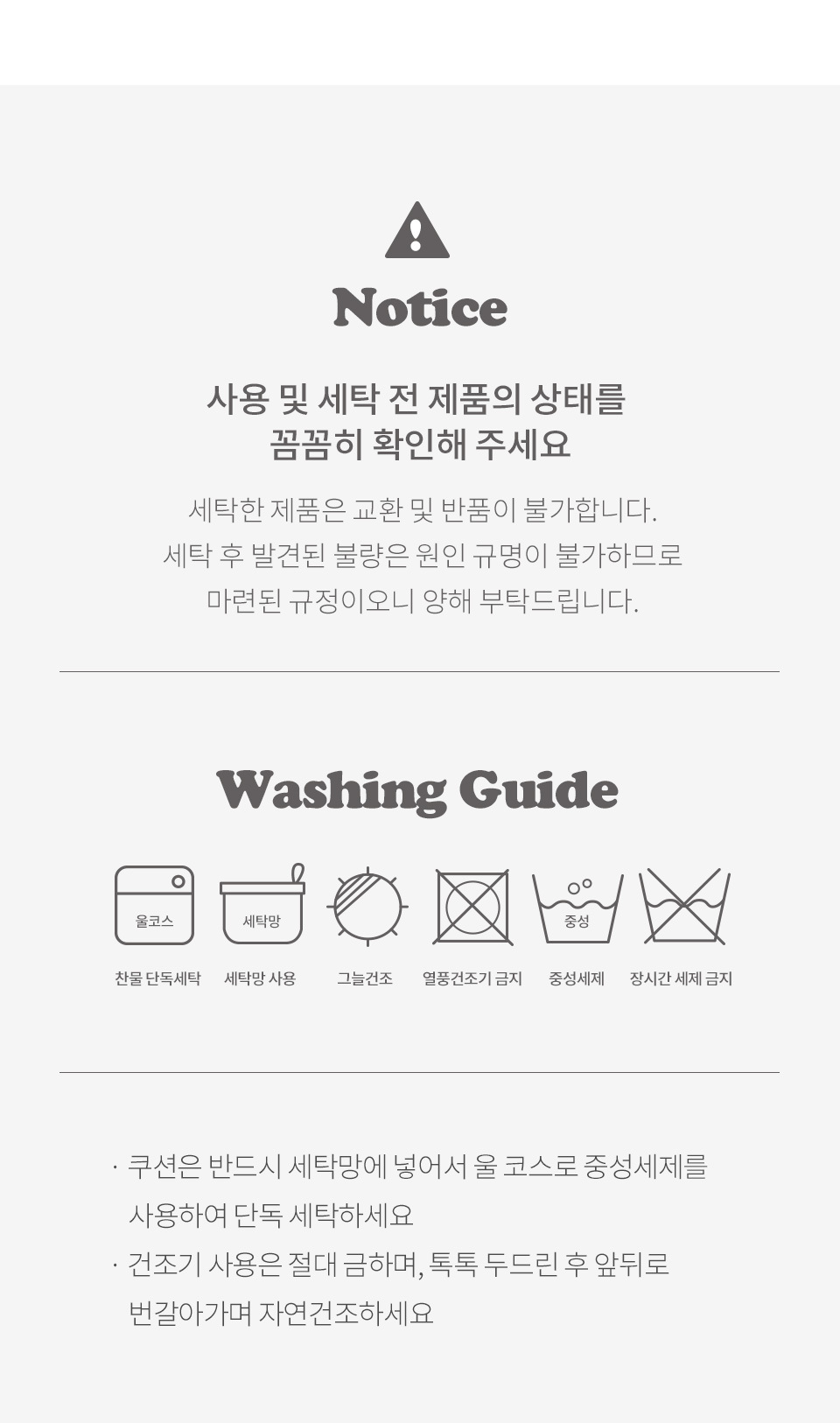 · 건조기 사용 시 제품에 손상이나 수축 및 변형이 올 수 있으므로 자연 건조를 권장 드립니다.