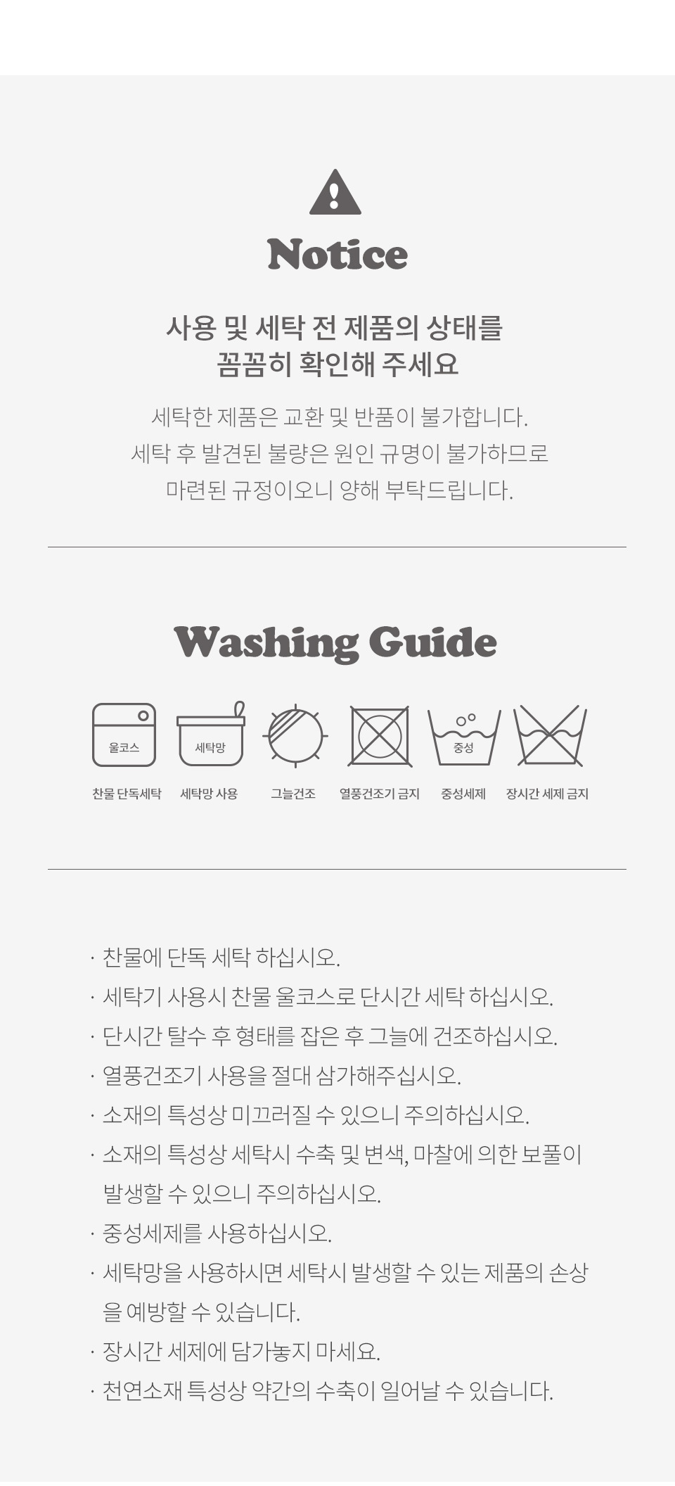 · 건조기 사용 시 제품에 손상이나 수축 및 변형이 올 수 있으므로 자연 건조를 권장 드립니다.