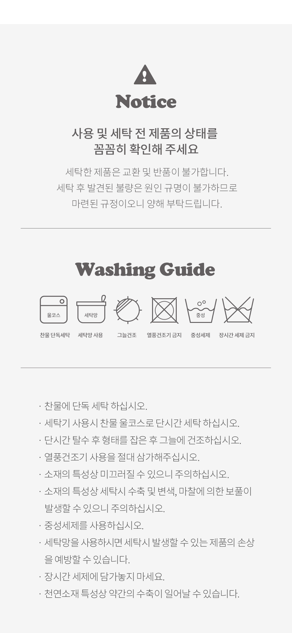 · 건조기 사용 시 제품에 손상이나 수축 및 변형이 올 수 있으므로 자연 건조를 권장 드립니다.