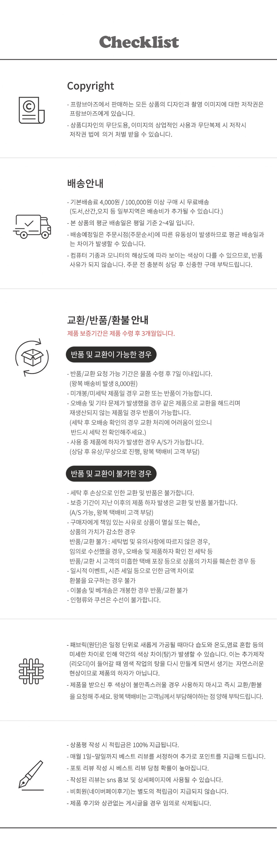 · 사이즈 및 색상 교환은 세탁 전에만 가능하며 제품 불량이 아닐 경우에는 택배비는 고객 부담입니다.
