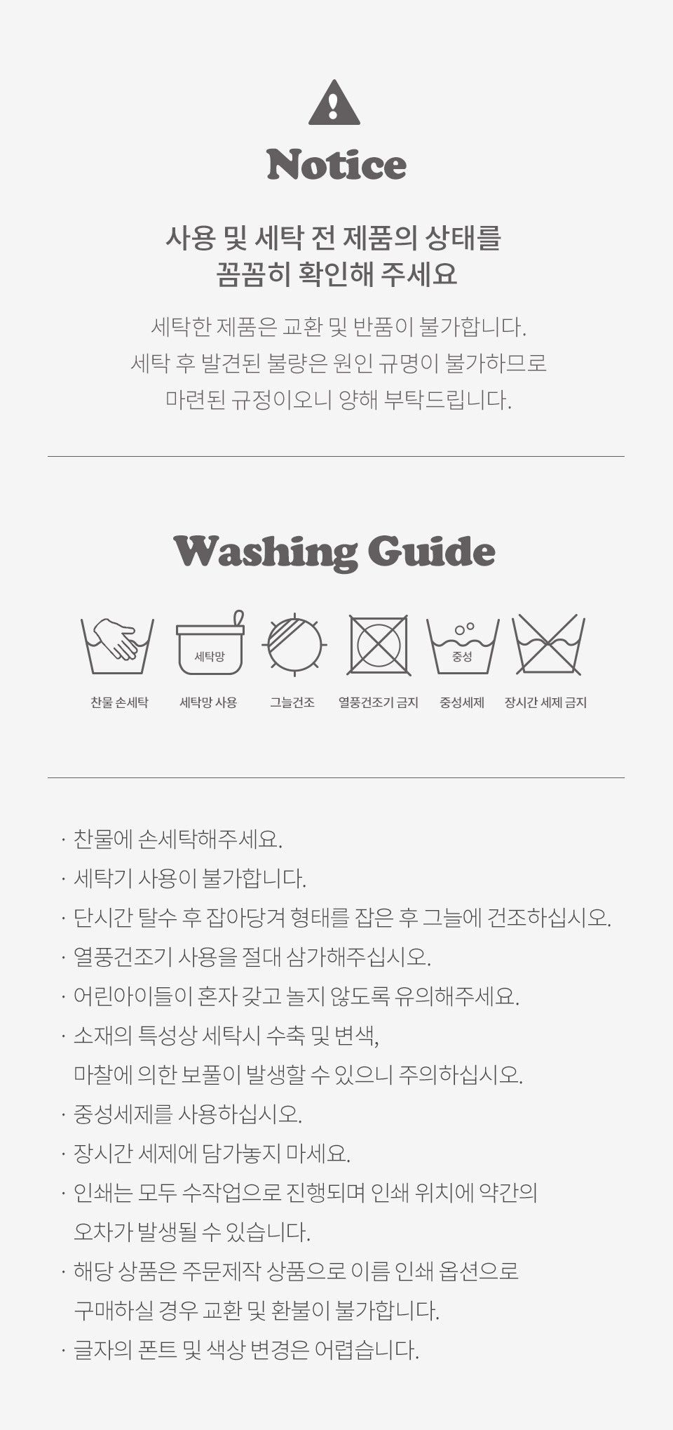 · 건조기 사용 시 제품에 손상이나 수축 및 변형이 올 수 있으므로 자연 건조를 권장 드립니다.
