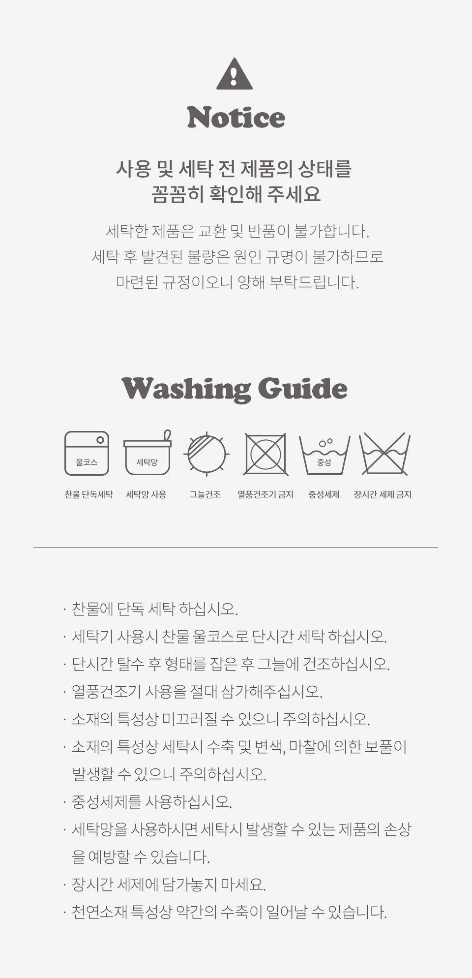 · 건조기 사용 시 제품에 손상이나 수축 및 변형이 올 수 있으므로 자연 건조를 권장 드립니다.