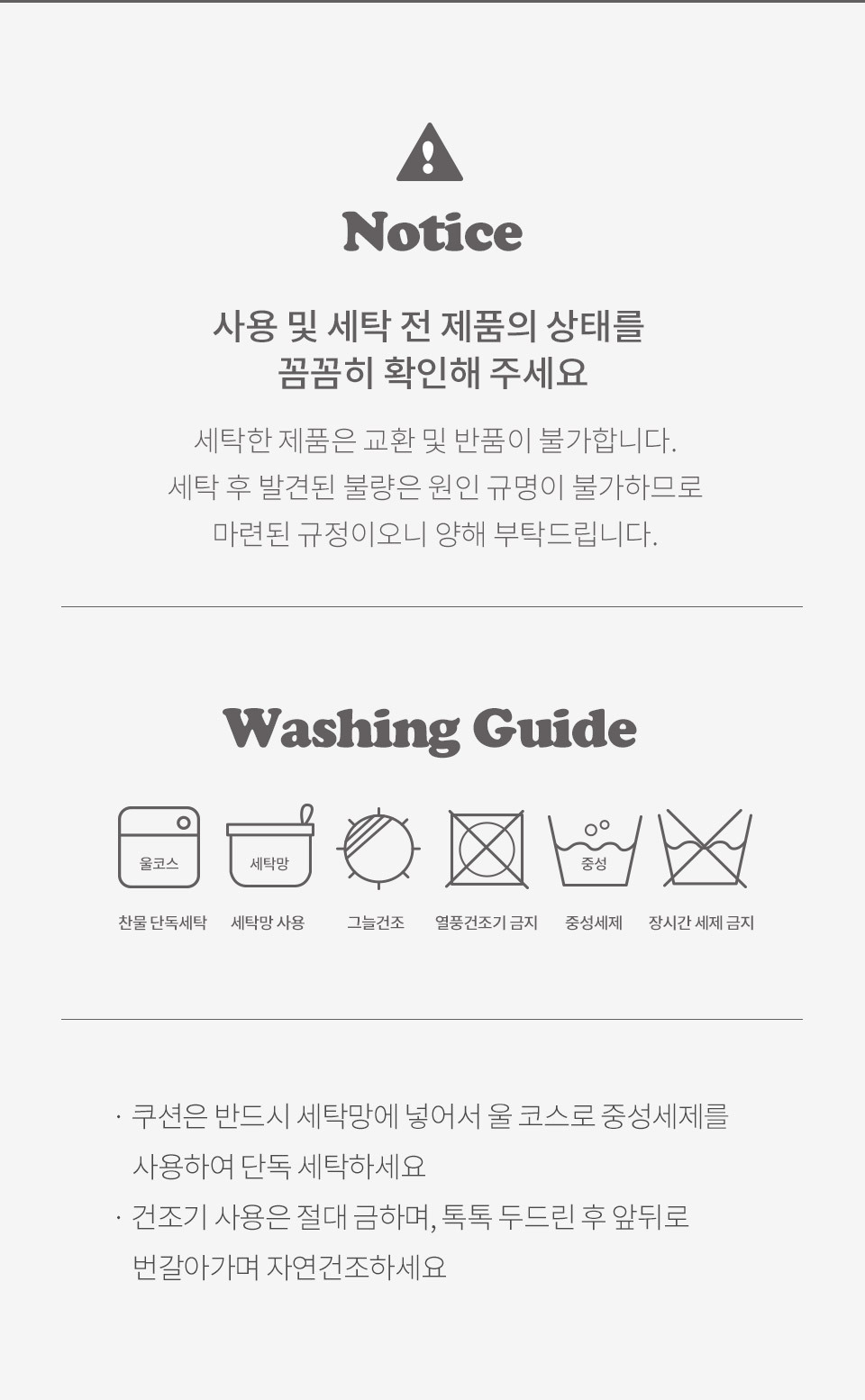 · 건조기 사용 시 제품에 손상이나 수축 및 변형이 올 수 있으므로 자연 건조를 권장 드립니다.