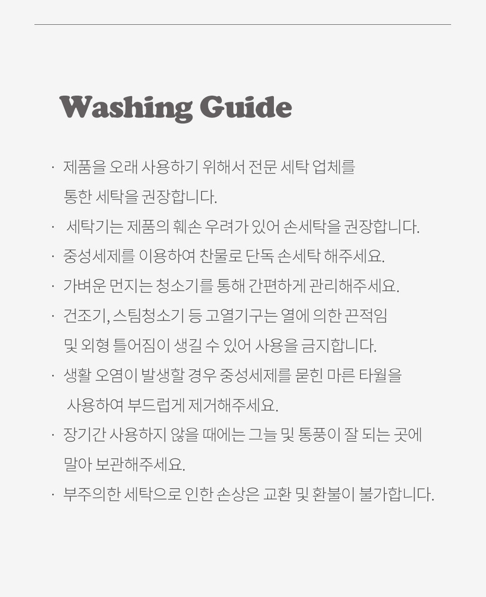 · 건조기 사용 시 제품에 손상이나 수축 및 변형이 올 수 있으므로 자연 건조를 권장 드립니다.