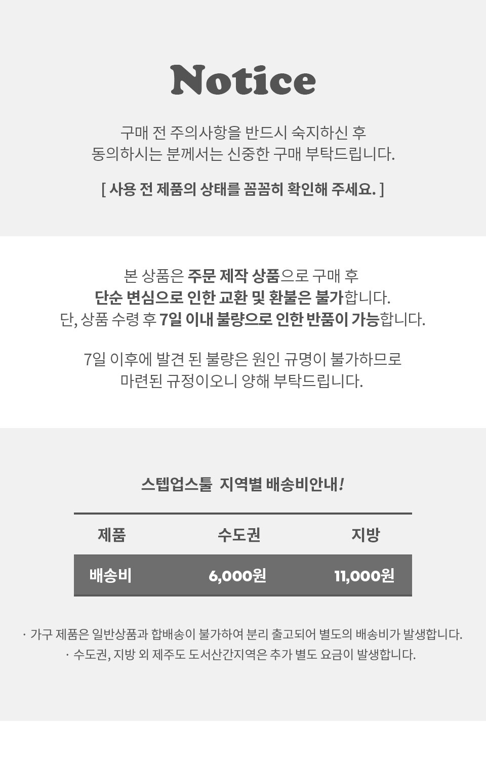 · 단순 변심에 의한 교환/환불의 경우 왕복 배송비 8,000원 부담