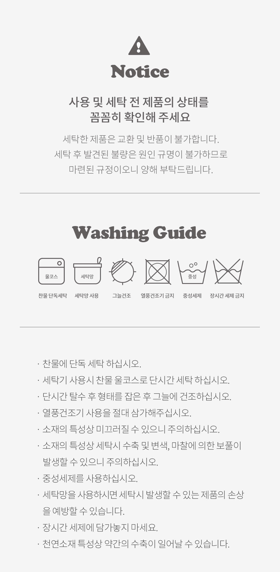 · 건조기 사용 시 제품에 손상이나 수축 및 변형이 올 수 있으므로 자연 건조를 권장 드립니다.