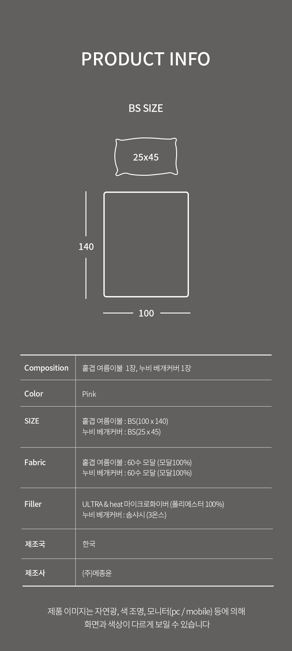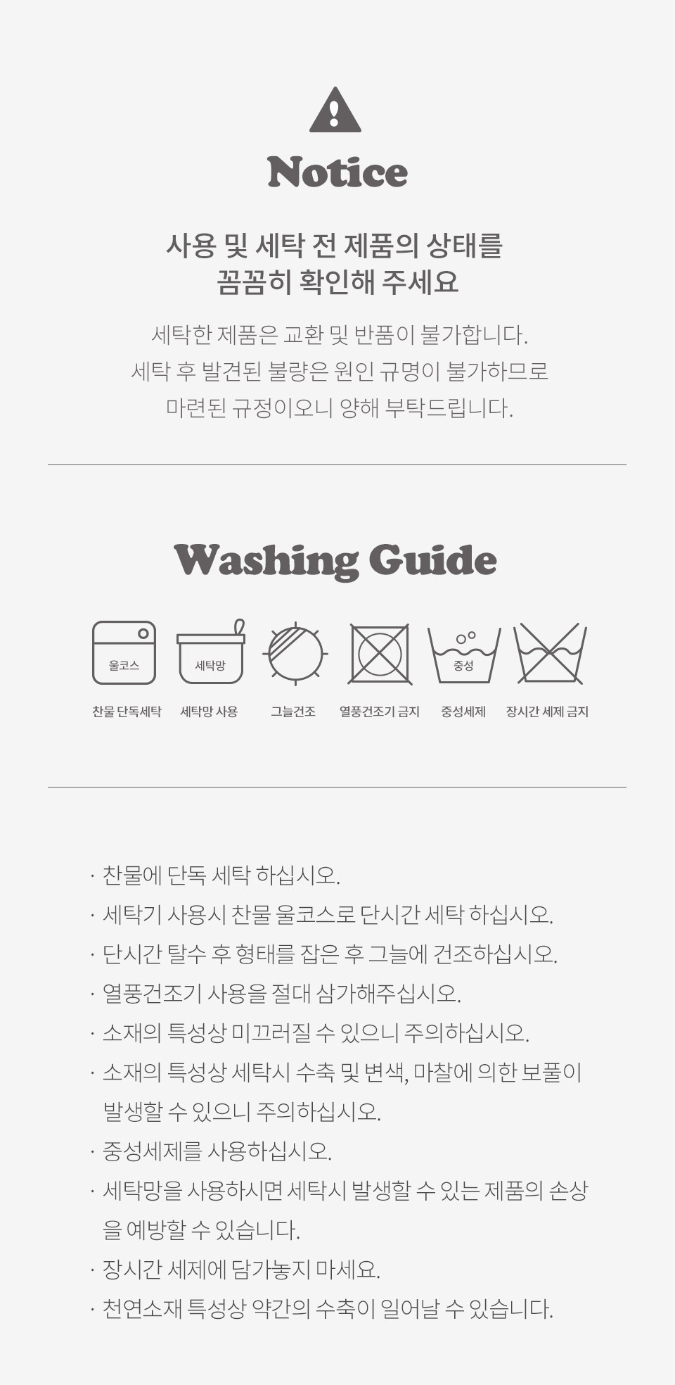 · 건조기 사용 시 제품에 손상이나 수축 및 변형이 올 수 있으므로 자연 건조를 권장 드립니다.