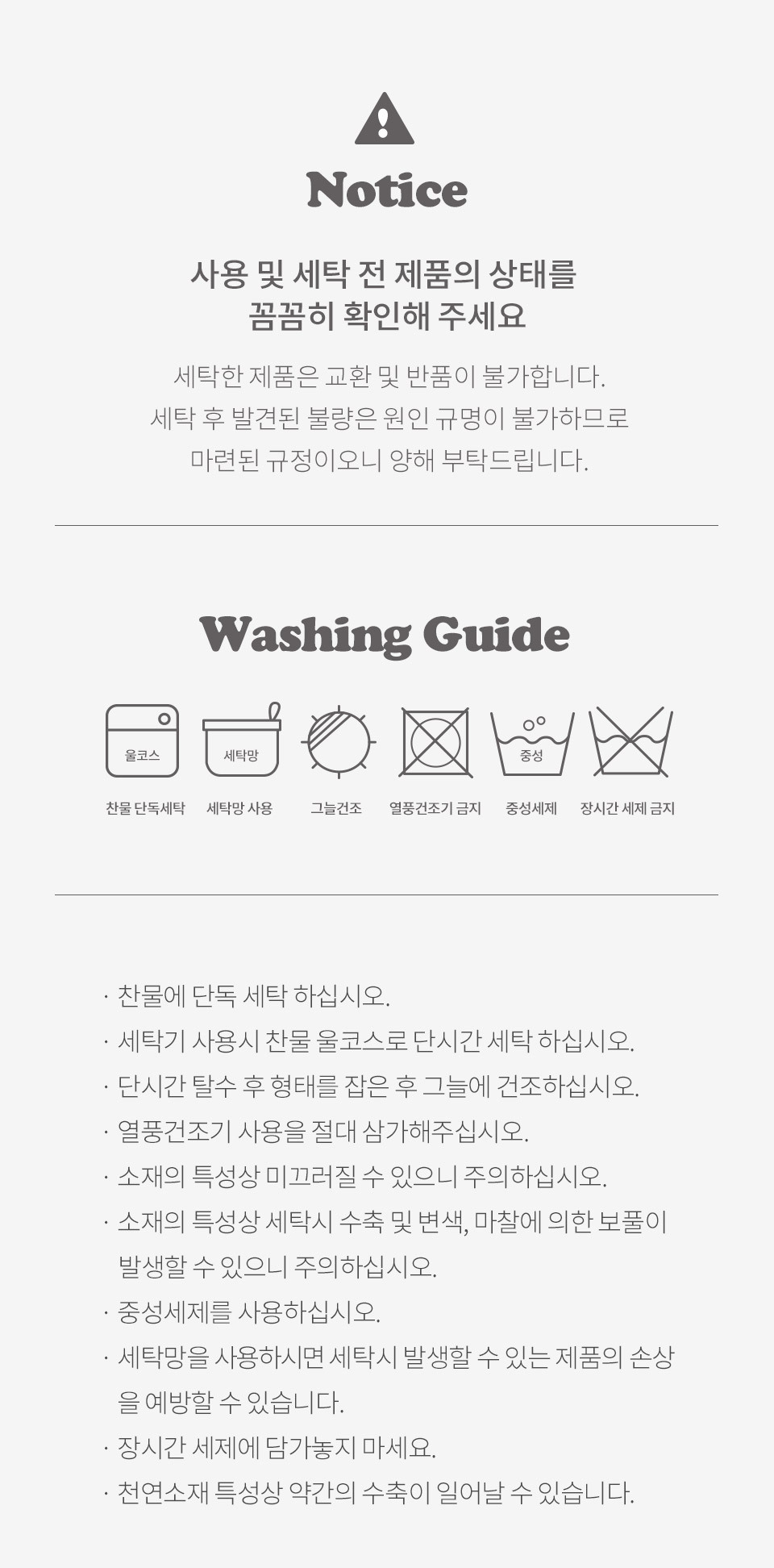 · 건조기 사용 시 제품에 손상이나 수축 및 변형이 올 수 있으므로 자연 건조를 권장 드립니다.
