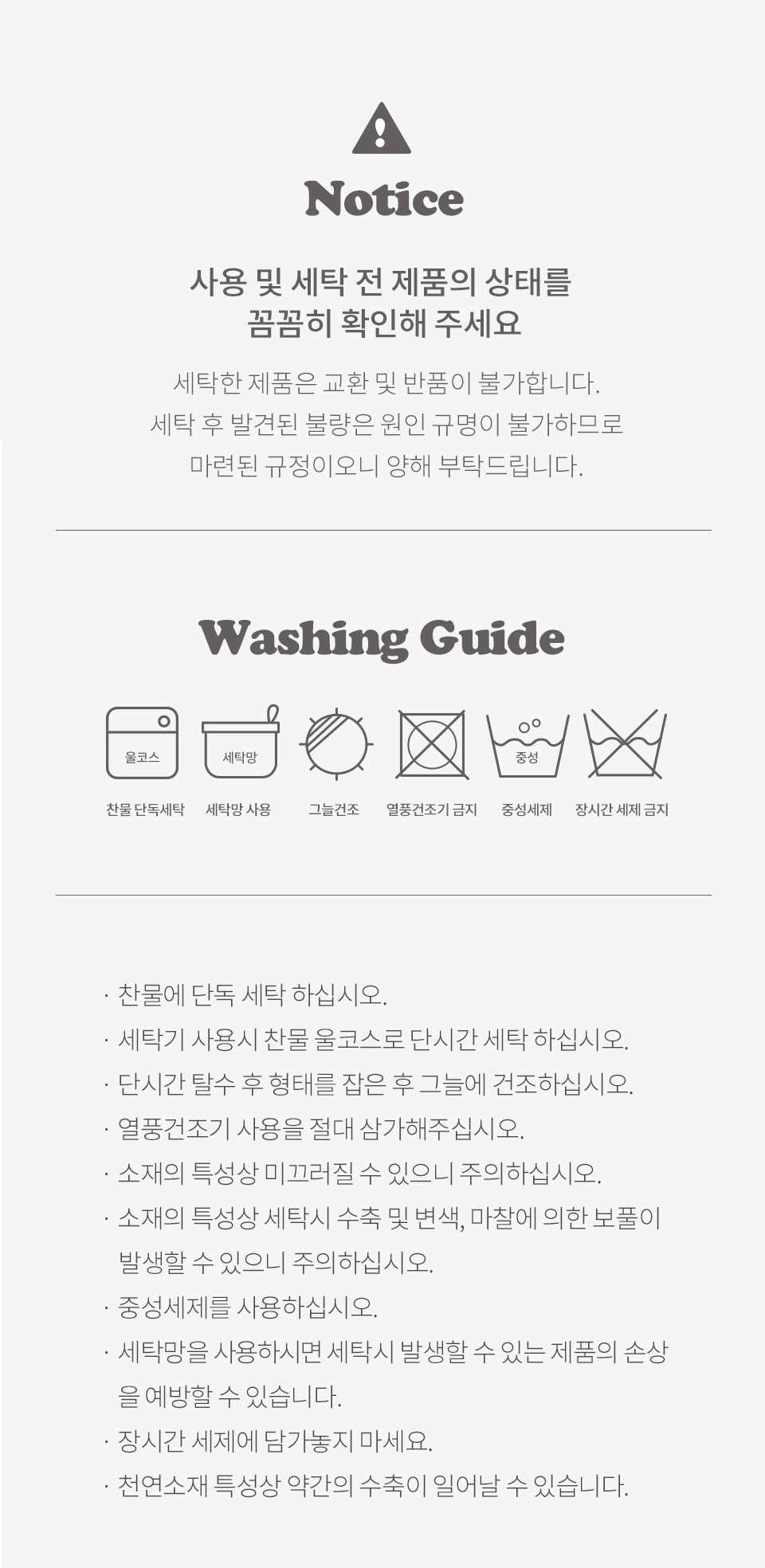 · 건조기 사용 시 제품에 손상이나 수축 및 변형이 올 수 있으므로 자연 건조를 권장 드립니다.