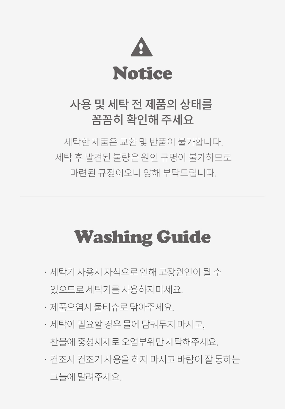 · 세탁 및 사용한 흔적이 있는 상품은 재판매가 어려워 반품 및 교환이 불가하오니 반드시 상품 수령 후 세탁 전 상품의 상태 및 주문과 동일한 상품인지 확인해주시기 바랍니다.