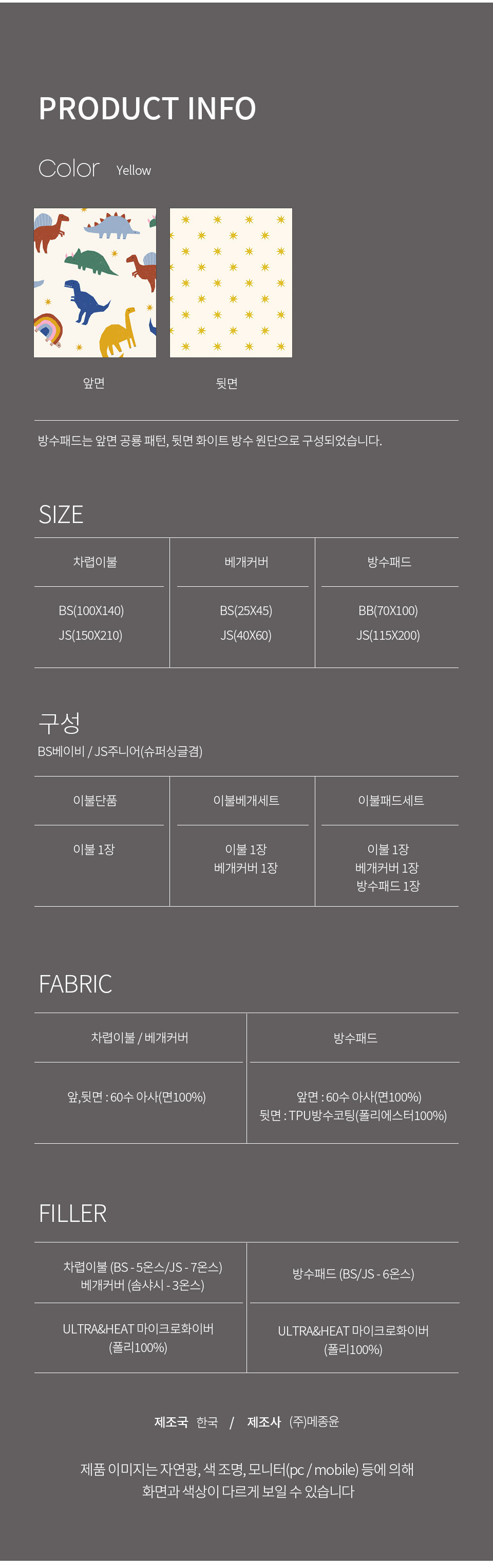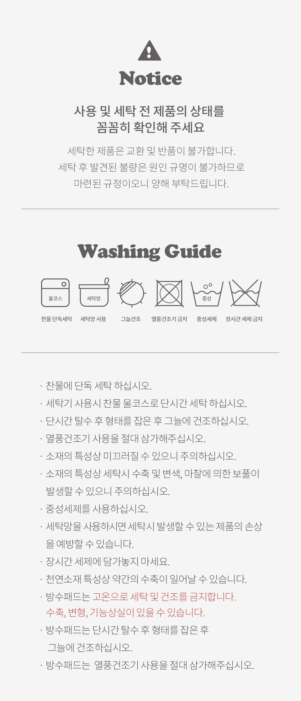 · 건조기 사용 시 제품에 손상이나 수축 및 변형이 올 수 있으므로 자연 건조를 권장 드립니다.