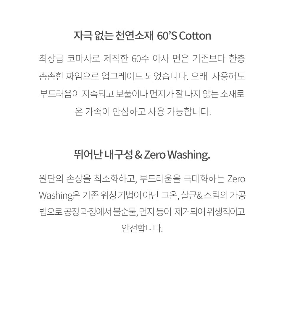 · 건조기 사용 시 제품에 손상이나 수축 및 변형이 올 수 있으므로 자연 건조를 권장 드립니다.