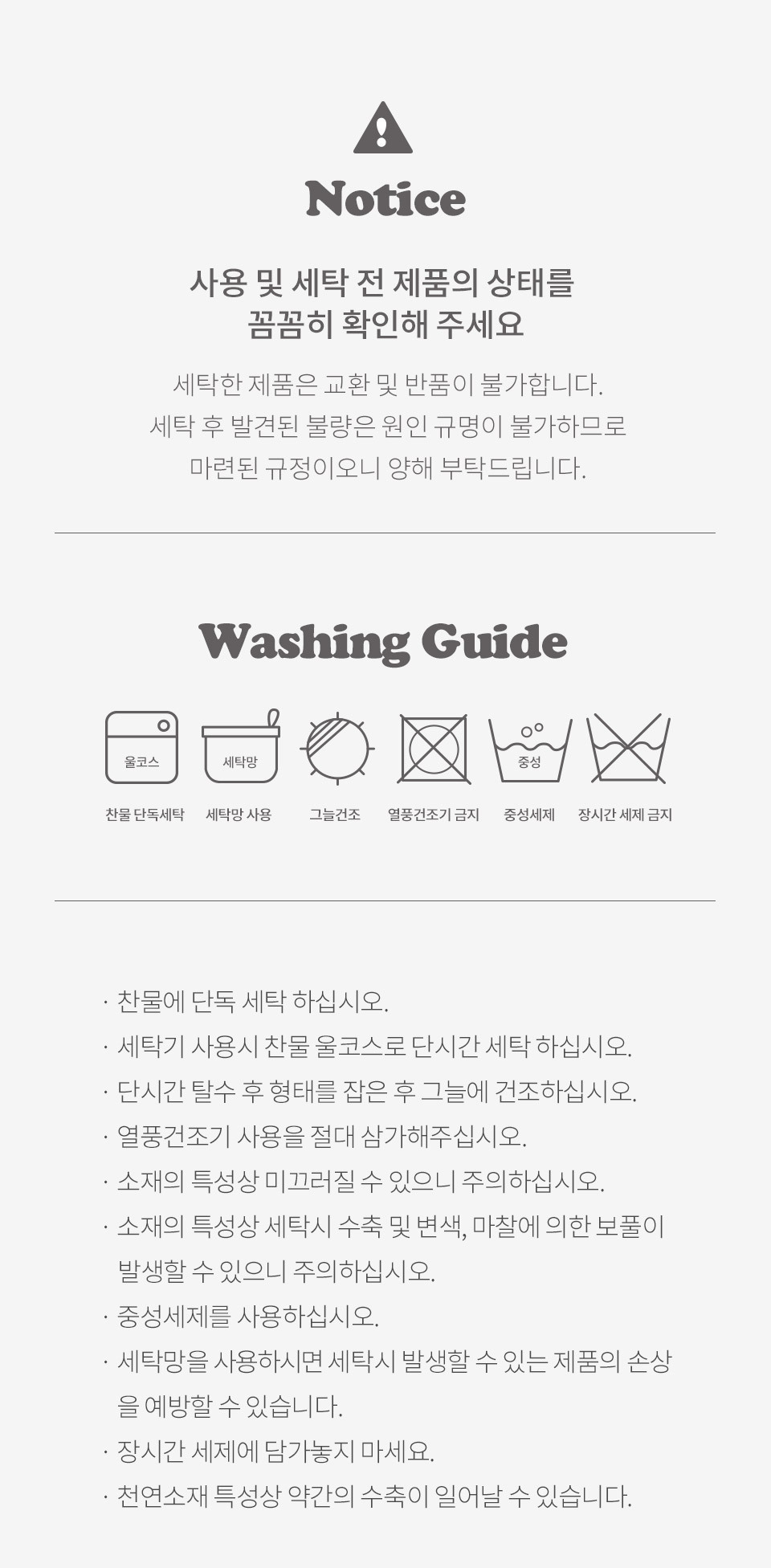 · 건조기 사용 시 제품에 손상이나 수축 및 변형이 올 수 있으므로 자연 건조를 권장 드립니다.