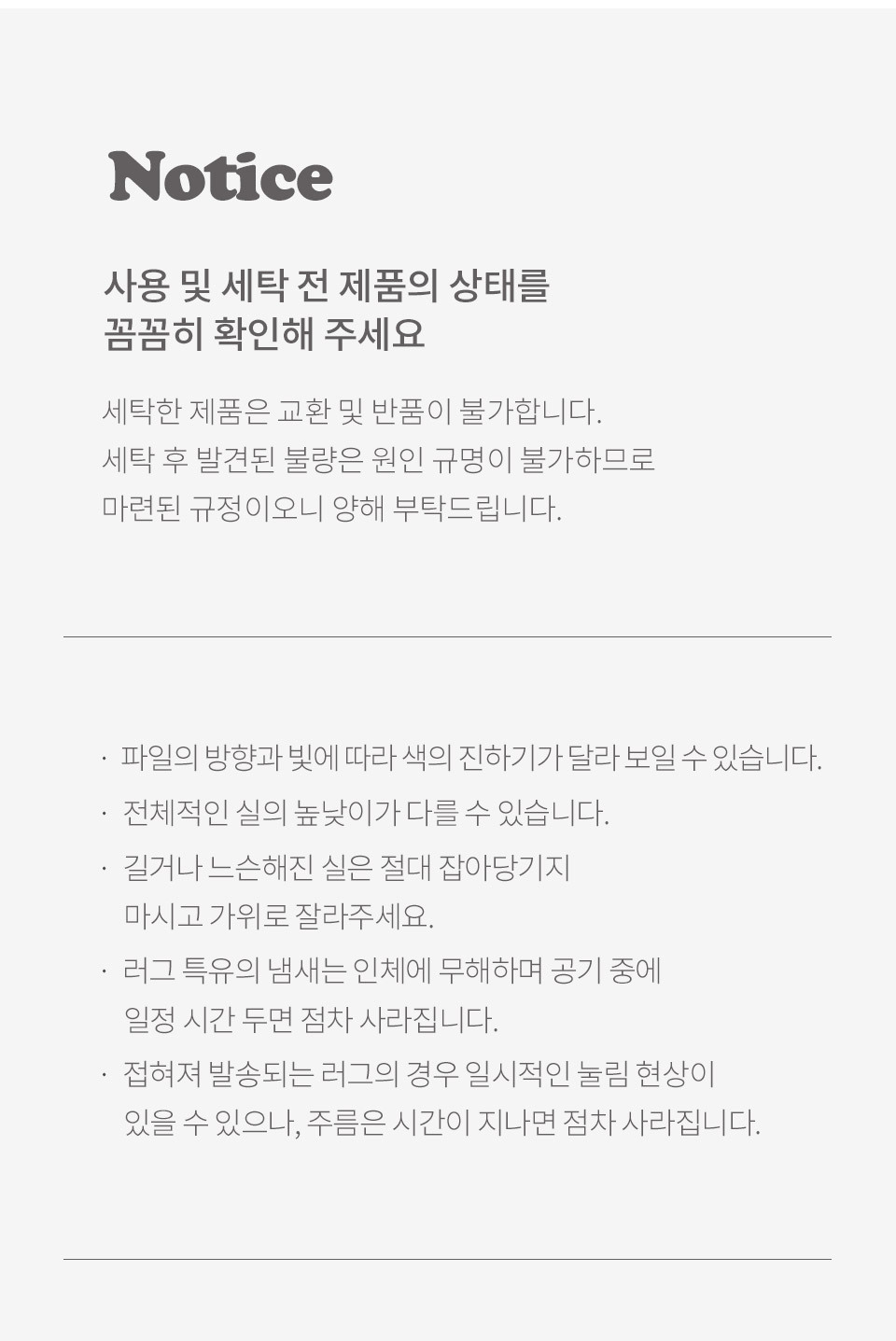 · 세탁 및 사용한 흔적이 있는 상품은 재판매가 어려워 반품 및 교환이 불가하오니 반드시 상품 수령 후 세탁 전 상품의 상태 및 주문과 동일한 상품인지 확인해주시기 바랍니다.