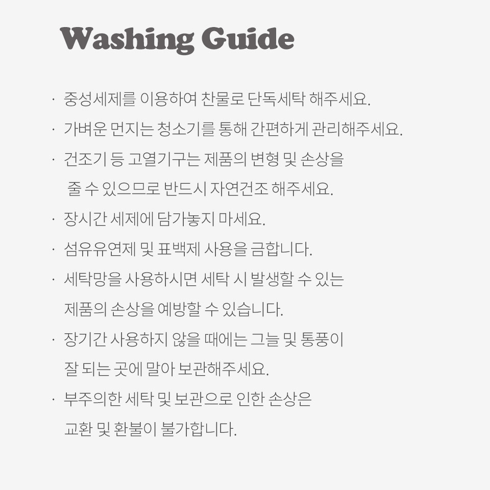 · 건조기 사용 시 제품에 손상이나 수축 및 변형이 올 수 있으므로 자연 건조를 권장 드립니다.