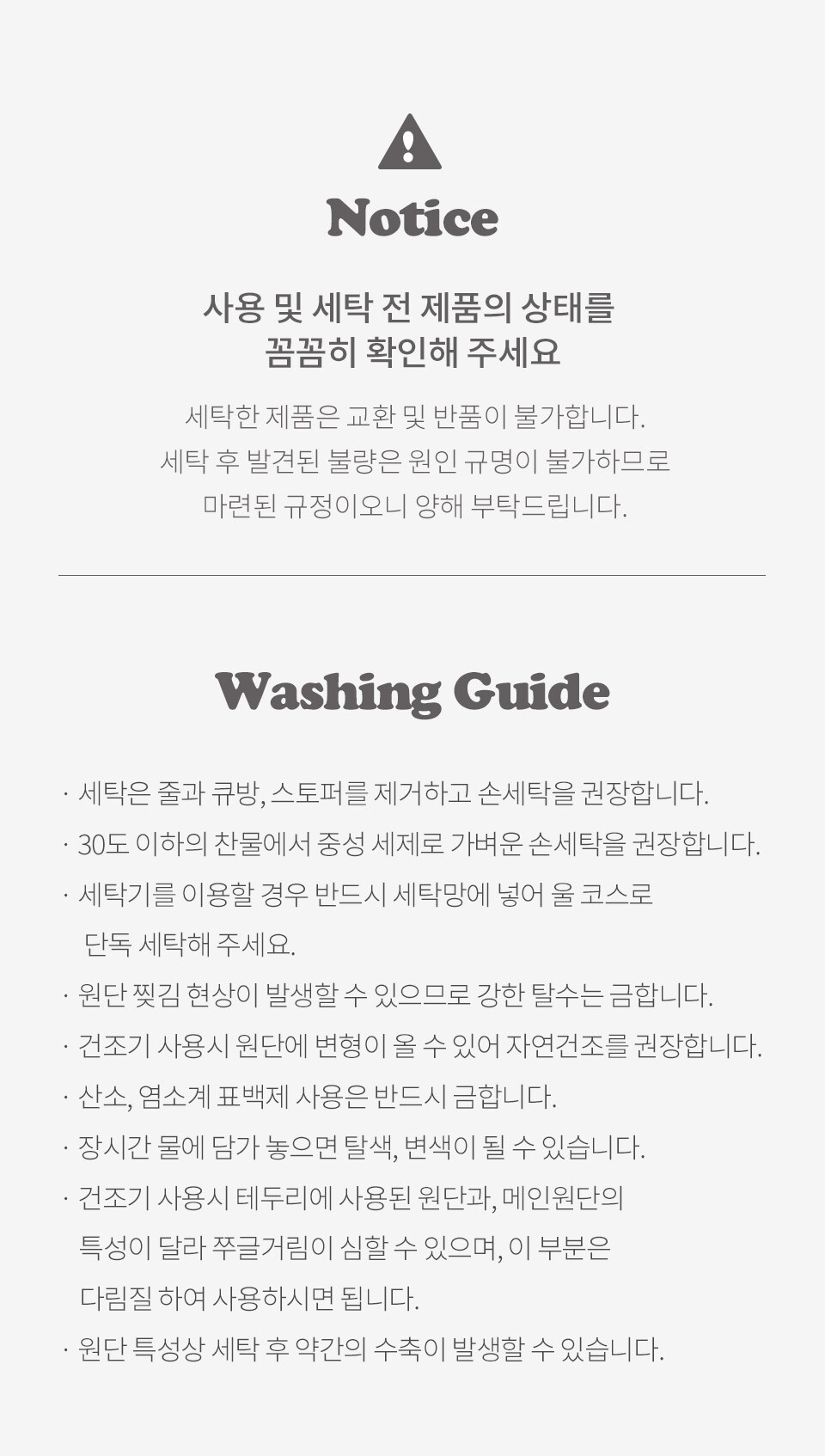 · 세탁 및 사용한 흔적이 있는 상품은 재판매가 어려워 반품 및 교환이 불가하오니 반드시 상품 수령 후 세탁 전 상품의 상태 및 주문과 동일한 상품인지 확인해주시기 바랍니다.