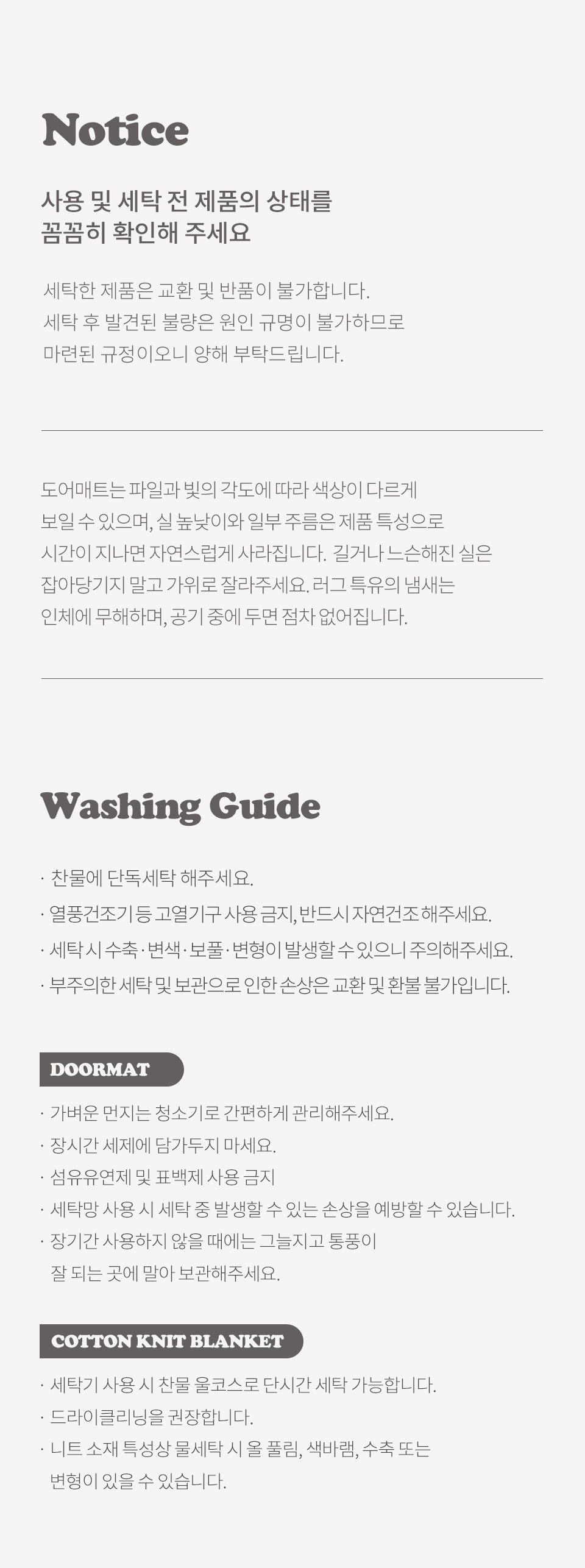 · 건조기 사용 시 제품에 손상이나 수축 및 변형이 올 수 있으므로 자연 건조를 권장 드립니다.