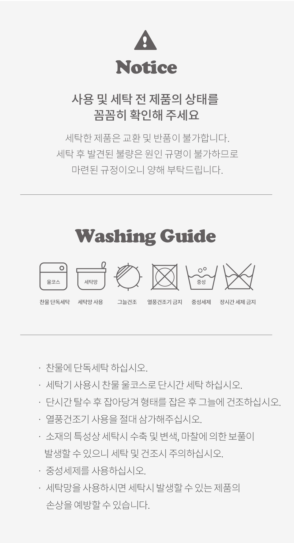 · 건조기 사용 시 제품에 손상이나 수축 및 변형이 올 수 있으므로 자연 건조를 권장 드립니다.
