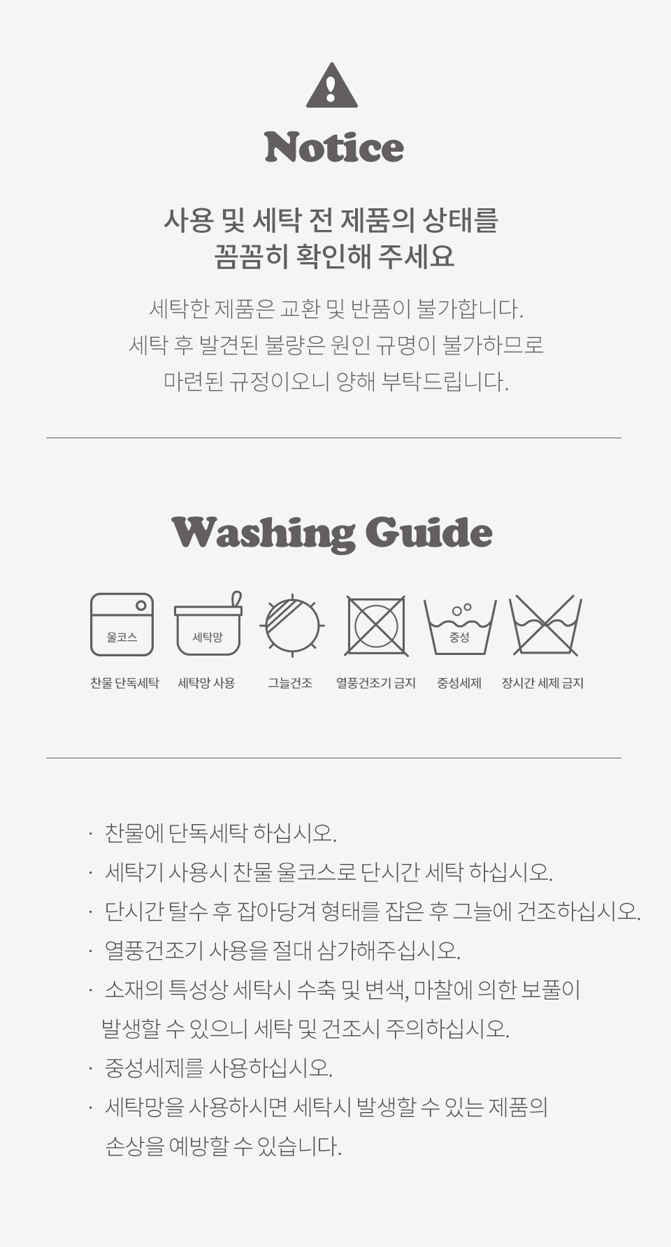· 건조기 사용 시 제품에 손상이나 수축 및 변형이 올 수 있으므로 자연 건조를 권장 드립니다.