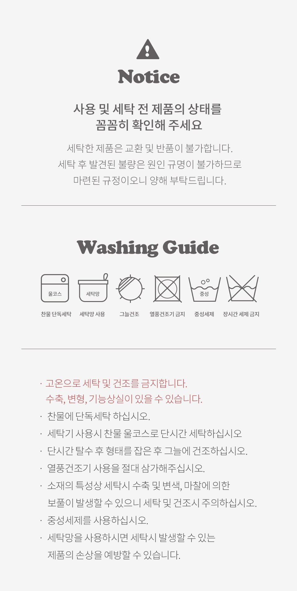 · 건조기 사용 시 제품에 손상이나 수축 및 변형이 올 수 있으므로 자연 건조를 권장 드립니다.