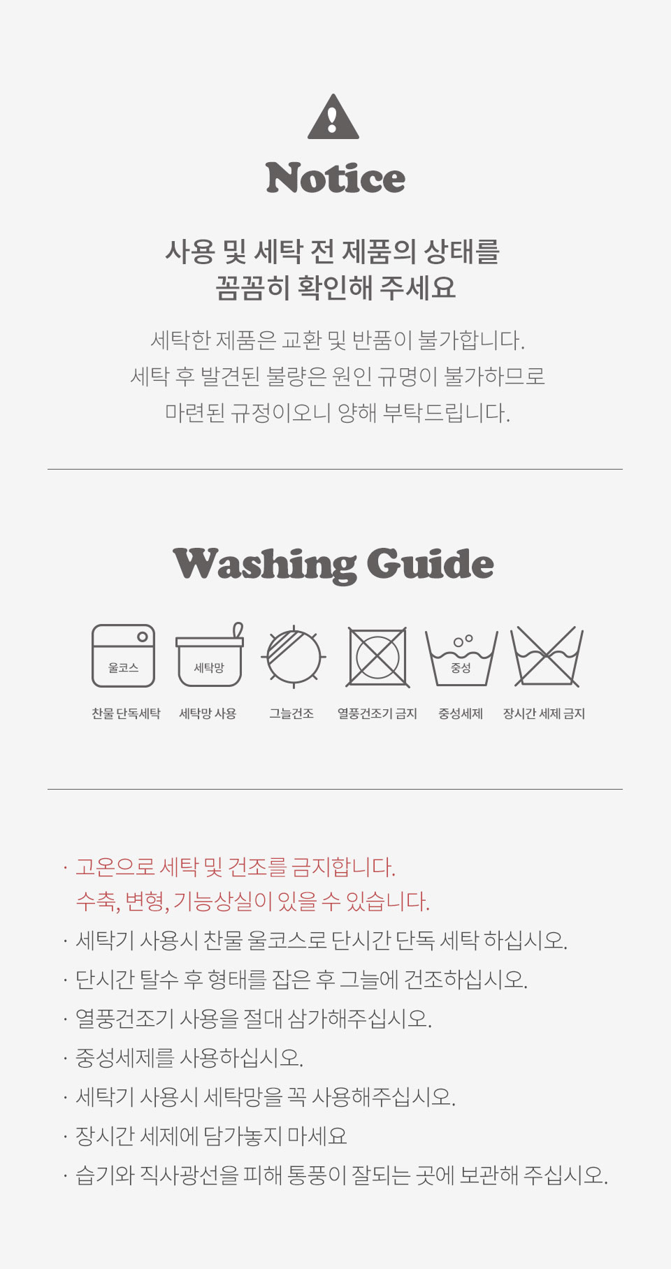 · 건조기 사용 시 제품에 손상이나 수축 및 변형이 올 수 있으므로 자연 건조를 권장 드립니다.