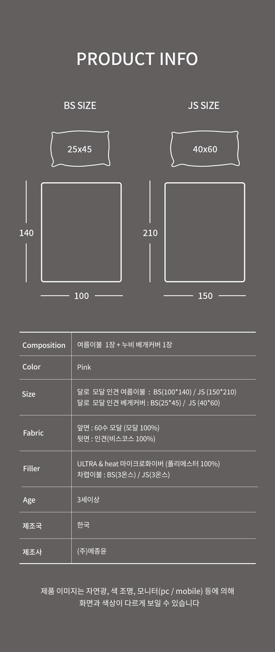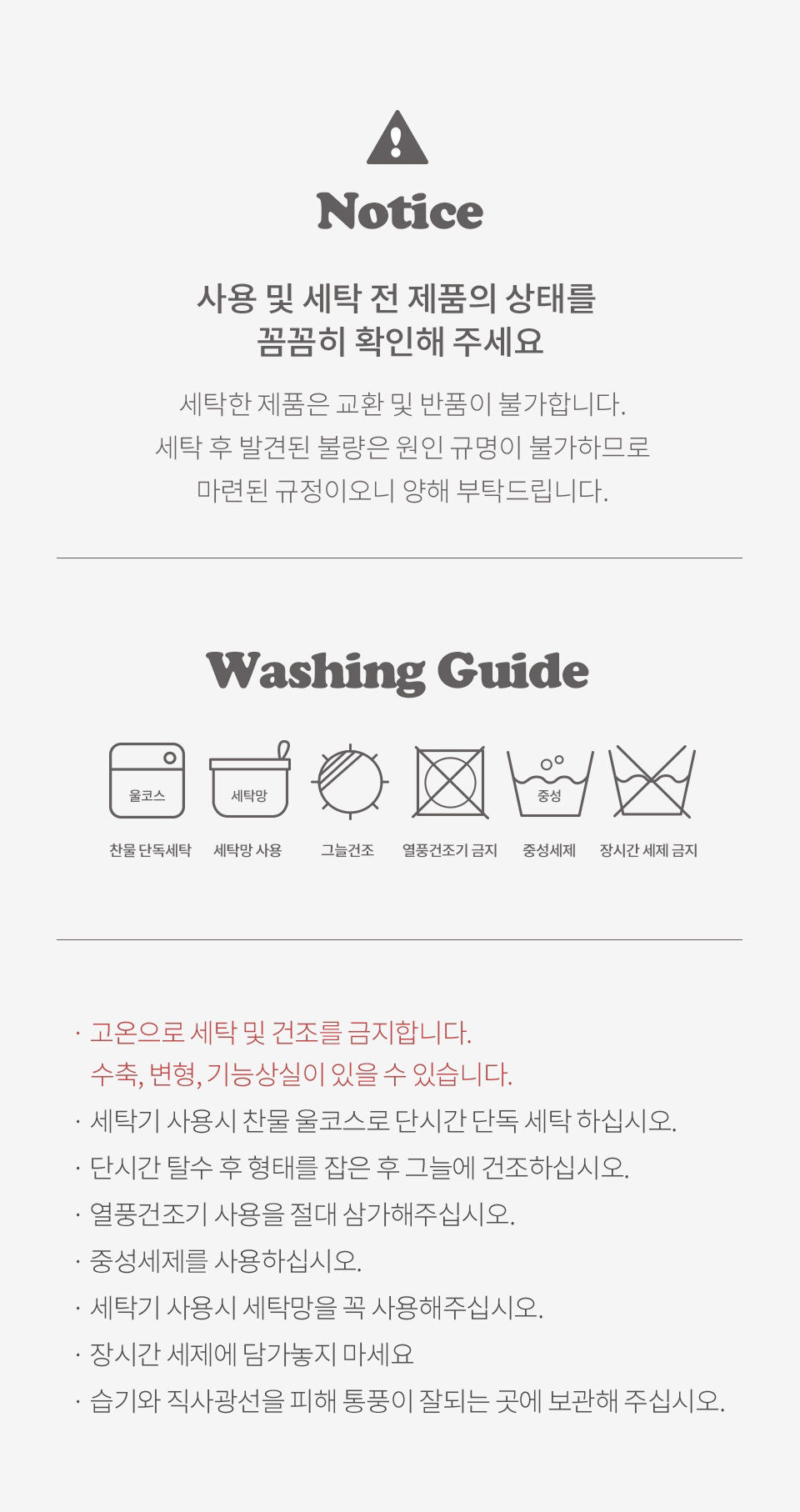 · 건조기 사용 시 제품에 손상이나 수축 및 변형이 올 수 있으므로 자연 건조를 권장 드립니다.